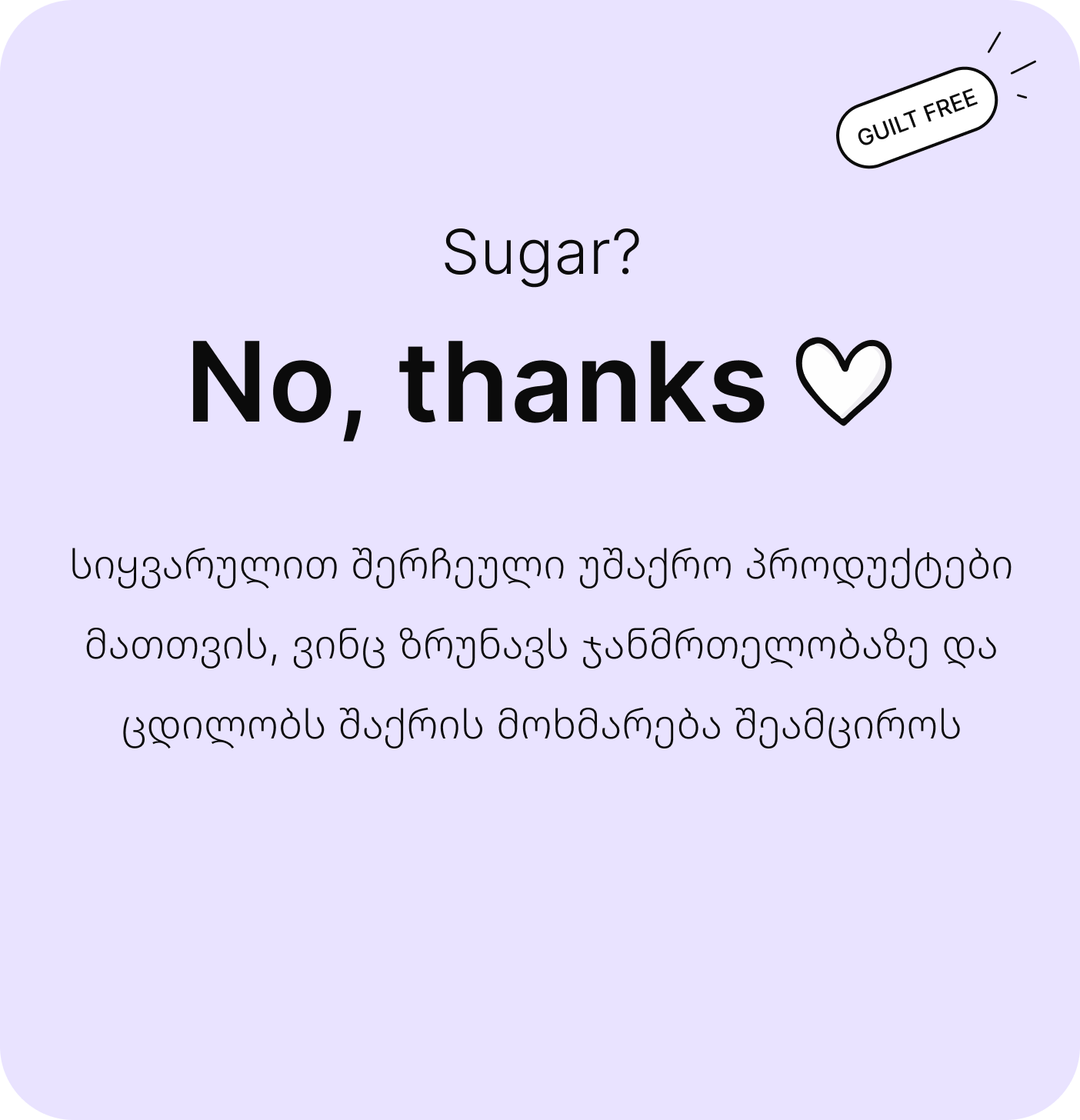 დაათვალიერე პროდუქტები დაათვალიერე პროდუქტები კატეგორიები დამატკბობლები → ჯემები → ტკბილეული → კატეგორიები შაქრის შემცვლელები → ჯემები → ტკბილეული → ფიქრობდი, რომ შაქრის გარეშე მოსაწყენია? დროა გადაიფიქრო ჩვენ ვარჩევთ პროდუქტებს თქვენთვის, რომლებიც ამ სტერეოტიპს დაამსხვრევს. გემო რჩება, შაქარი კი არა. მიირთვი გემრიელად დანაშაულის გრძნობის გარეშე. რჩეული ბრენდები რჩეული ბრენდები