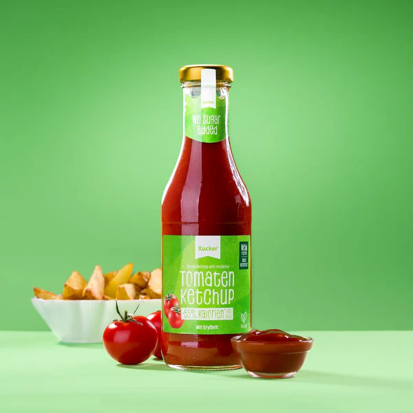 Xucker-ის ტომატის კეტჩუპი ერითრიტოლით: ხილისებრი და სუფთა გემოს მქონე კეტჩუპი Xucker-ისგან დატკბობილია კბილებისთვის უსაფრთხო ერითრიტოლით. მარტივად უგემრიელესი და იდეალურია თქვენი შემდეგი ბარბექიუს წვეულებისთვის.