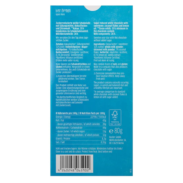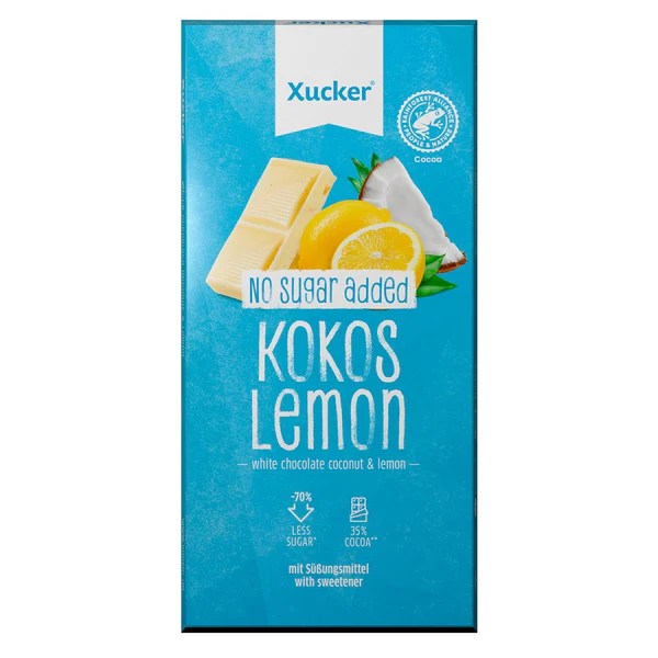 თეთრი შოკოლადი შაქრის შემცვლელი დამატკბობლით, ქსილიტოლით.